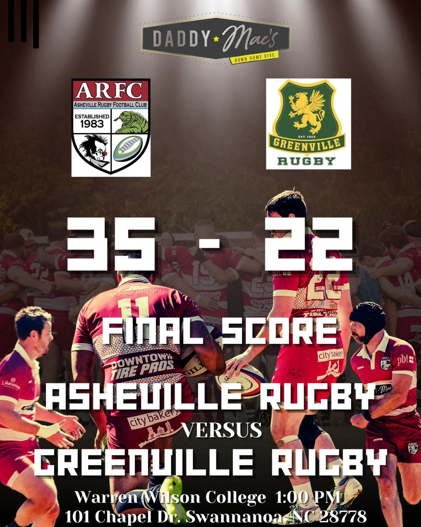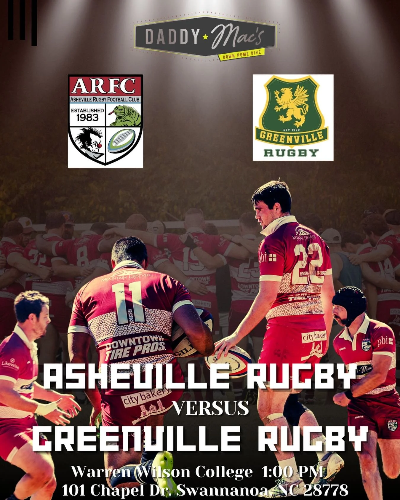 Massive shout-out to Daddy Mac’s for backing Asheville Rugby and welcoming our players, fans, and opponents with open arms (and full glasses). They support the club, we support the bar, and the tradition continues—so grab a pint, talk some nonsense, and join the ARFC chaos.
